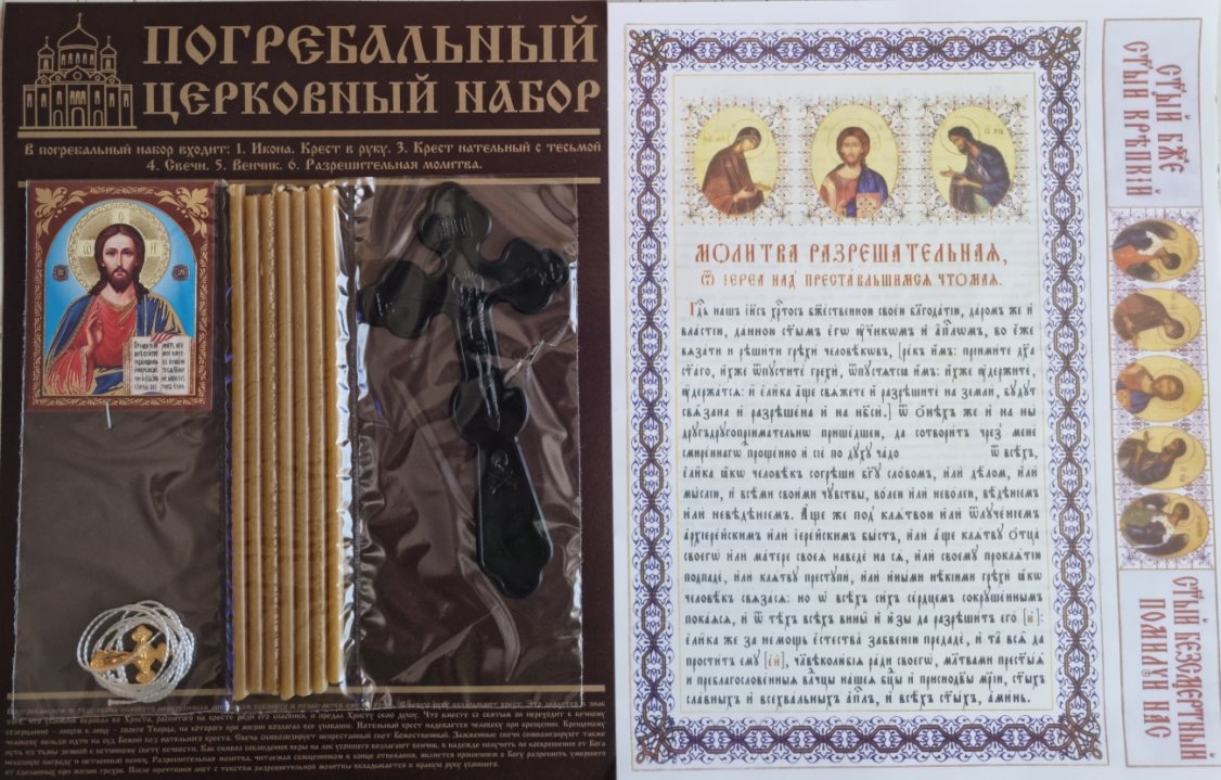 Погребальный церковный набор (для мужчин) входит: икона; крест в руку; крест нательный с тесьмой; свечи; венчик; разрешительная молитва. арт.004